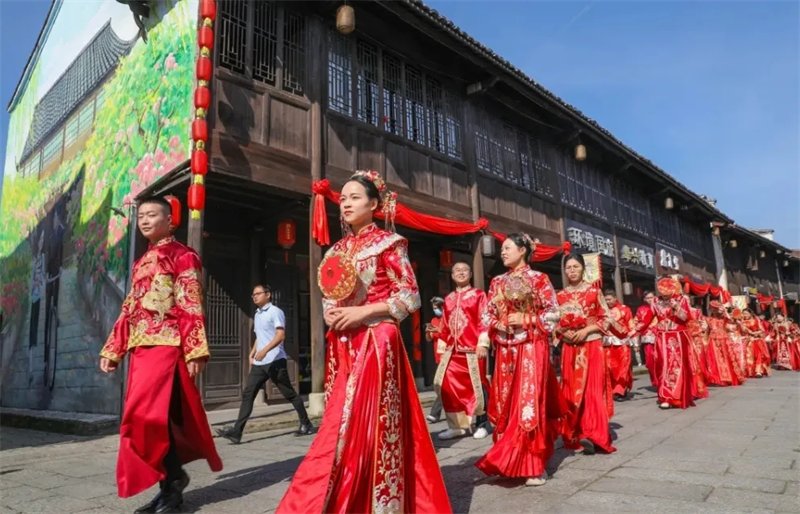 吉安市吉州区在钓源古村十里芳菲举办中式集体婚礼。活动中,18对新人们身着盛装礼服,手牵红绸踏上爱的红毯,缓缓步入婚礼舞台,依次进行白首成约、阙扇礼、合卺礼、撒帐礼等一系列互动活动。整场集体婚礼没有震耳鞭炮,没有奢华酒席,没有豪华婚车,流程简单,却仪式感满满,现场氛围热闹。