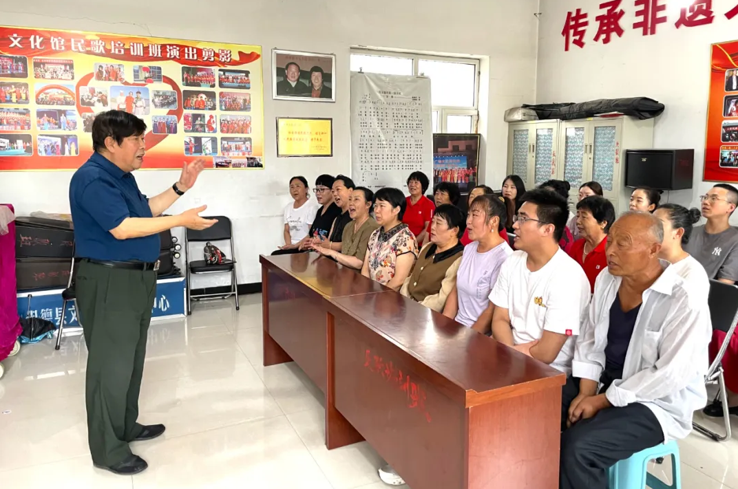 8月9日,在保德县文化馆,山西省级非物质文化遗产项目(保德民歌)代表性传承人、“黄河之滨民歌王”杨仲青现场教授保德民歌唱法。新华网 任钰 摄
