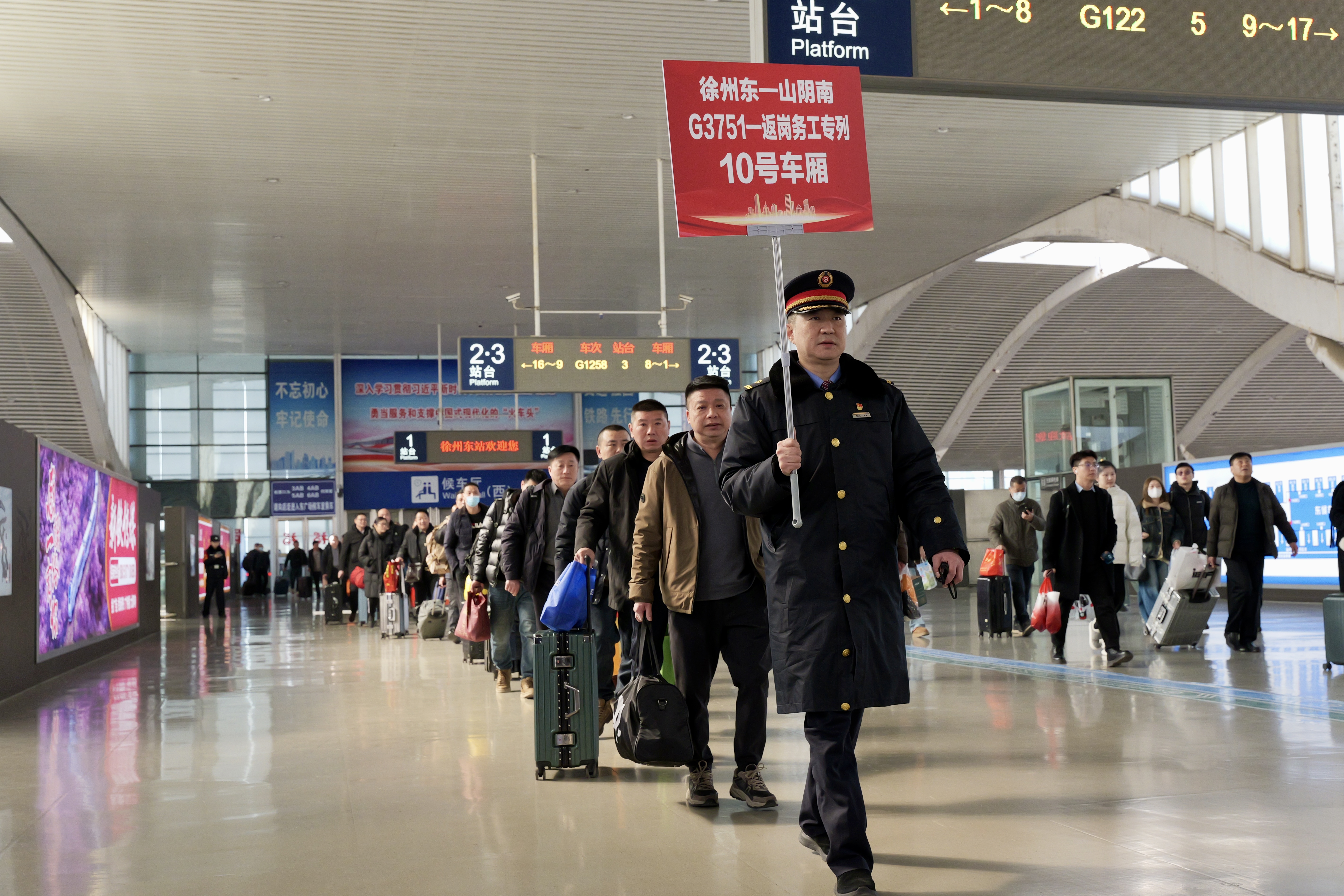 徐州东站,工作人员在引导务工返岗旅客乘车。